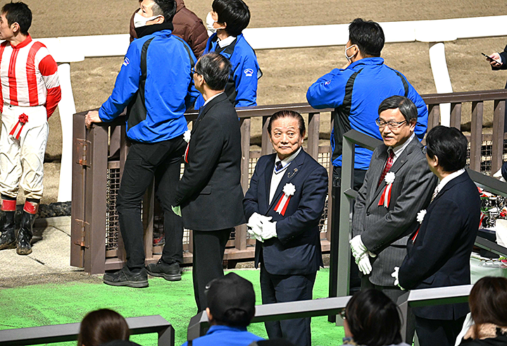 この日の重賞レースの表彰式では、竹之内康一 理事長から、優勝した騎手・調教師などに安納芋4箱が贈呈されました。