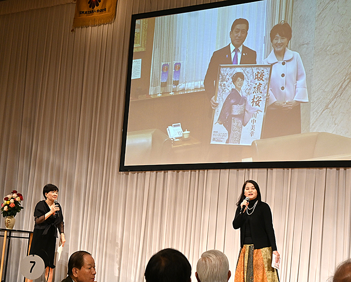 また、今年2月に発表された歌手・川中美幸さんの「暖流桜」という歌も紹介されました。この"桜"は、1月下旬に咲く緋寒桜しかなかった種子島の人たちが「本土と同じソメイヨシノみたいな桜があればいいのに」という思いをくみ取り、昭和51年に県農業開発センタ―の努力で品種改良された桜で、いわば種子島発の新種となっているそうです。この桜を題材に、鹿児島出身の京えりこさんが作詞され、それを川中さんが新曲として発表したということで、この大会に向けてビデオメッセージもいただき、会場からは大きな拍手でのお礼となりました。これも見事な「ふるさと自慢」と言って良いでしょう。