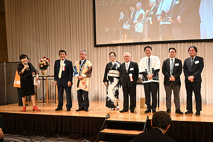 式典では竹之内康一副会長(当NPO法人理事長)が開会宣言を行い、坂元隆也会長が「みんなで、ふるさとのPRをして応援していきましょう」と挨拶をされました。また、塩田知事も「鹿児島県の農業生産は、北海道に次いで全国第2位になった。黒毛和牛・黒豚・かんぱち・お茶など、素晴らしい産品があるのでもっとPRをしていきたい」と説明され「関東鹿児島県人会の皆さんも大活躍されており、たいへんありがたい」と挨拶されました。