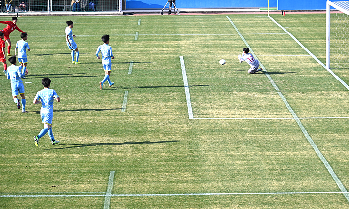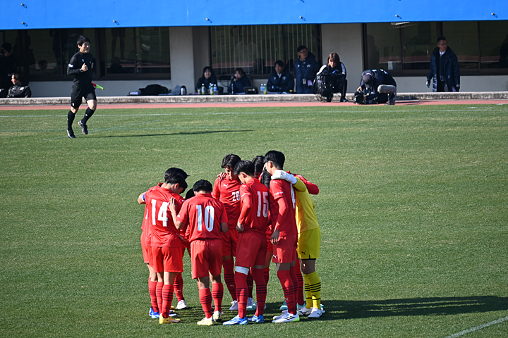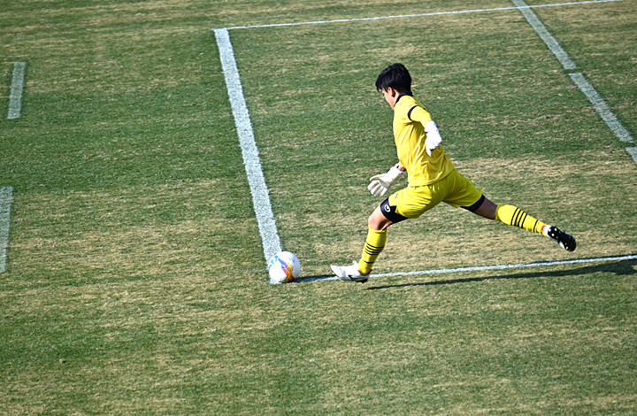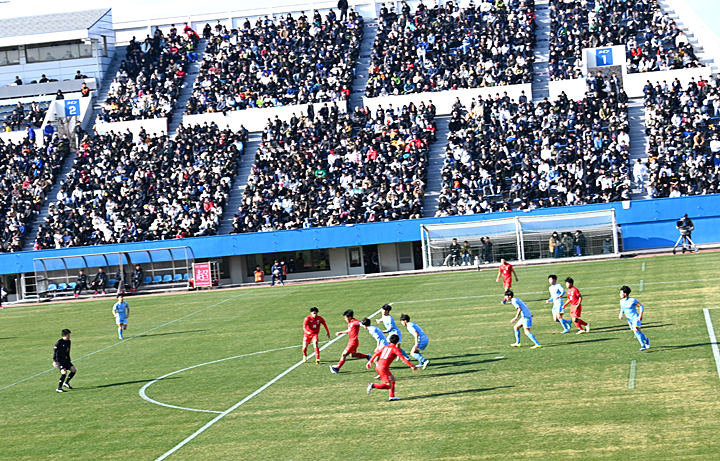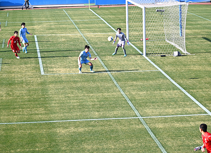 試合は、前半8分に、FW中村英貴選手の電光石火の見事なシュートで1点を先取し、その後も鹿児島城西高校が押し気味の試合展開で前半終了。ところが、後半10分に、ゴール前での札幌大谷高校の猛攻に思わぬ反則を取られてPKとなり同点に。その後は一進一退の攻防が繰り広げられ、1対1のまま試合終了、PK戦に突入しました。 このPK戦でも一進一退の手に汗にぎる攻防となり、最後は6人目を務めた札幌大谷高校のMF庄内巧真選手にシュートを決められ、惜しくも4-5で勝利を逃しました。